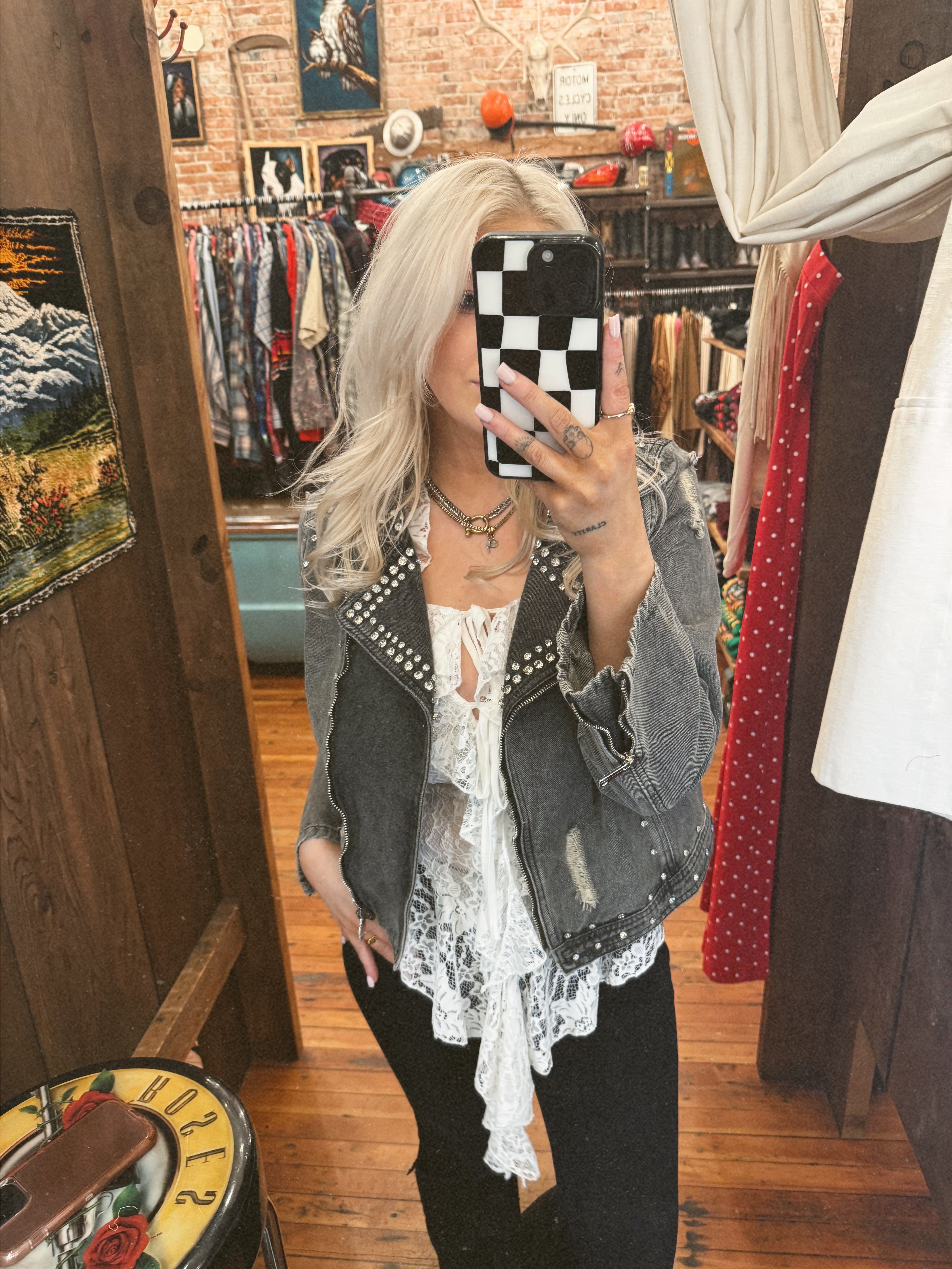 Turn every sidewalk into a stage in our Silver Bullet studded denim moto jacket. Designed with a classic moto silhouette and cover din shimmering crystal studs, this piece blends vintage rock-n-roll with a modern edge. Light distressing adds a worn feel.