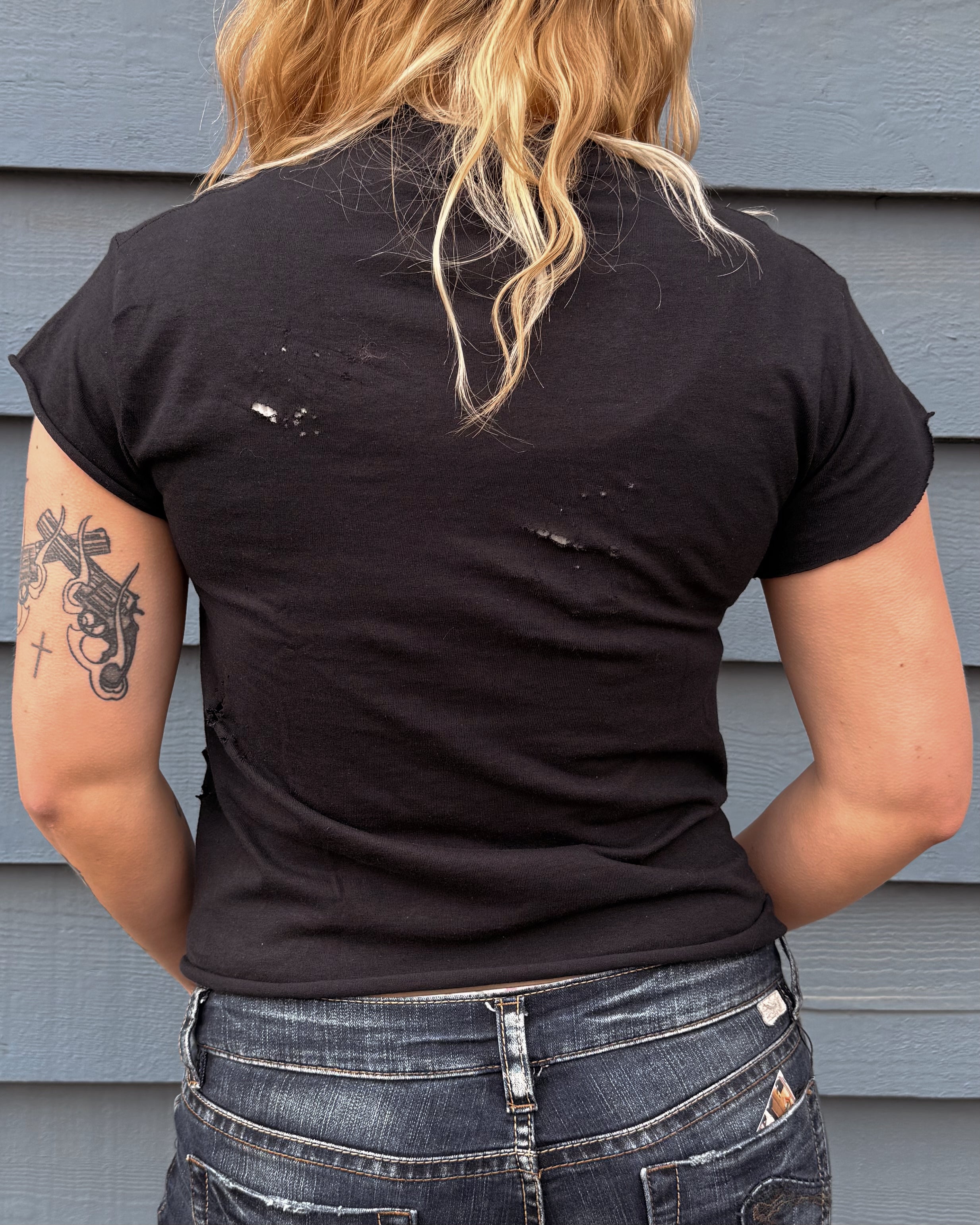 All Items are done in house. Our Chop Shop features one of a kind distressed, bleached, and dyed products done by one of our very own team members!