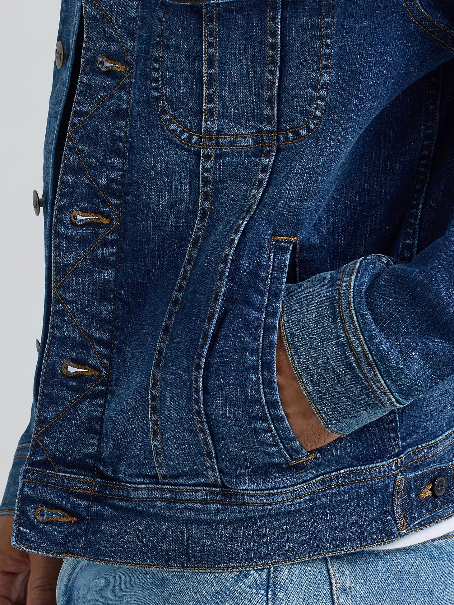 - Mid-indigo wash with natural fade