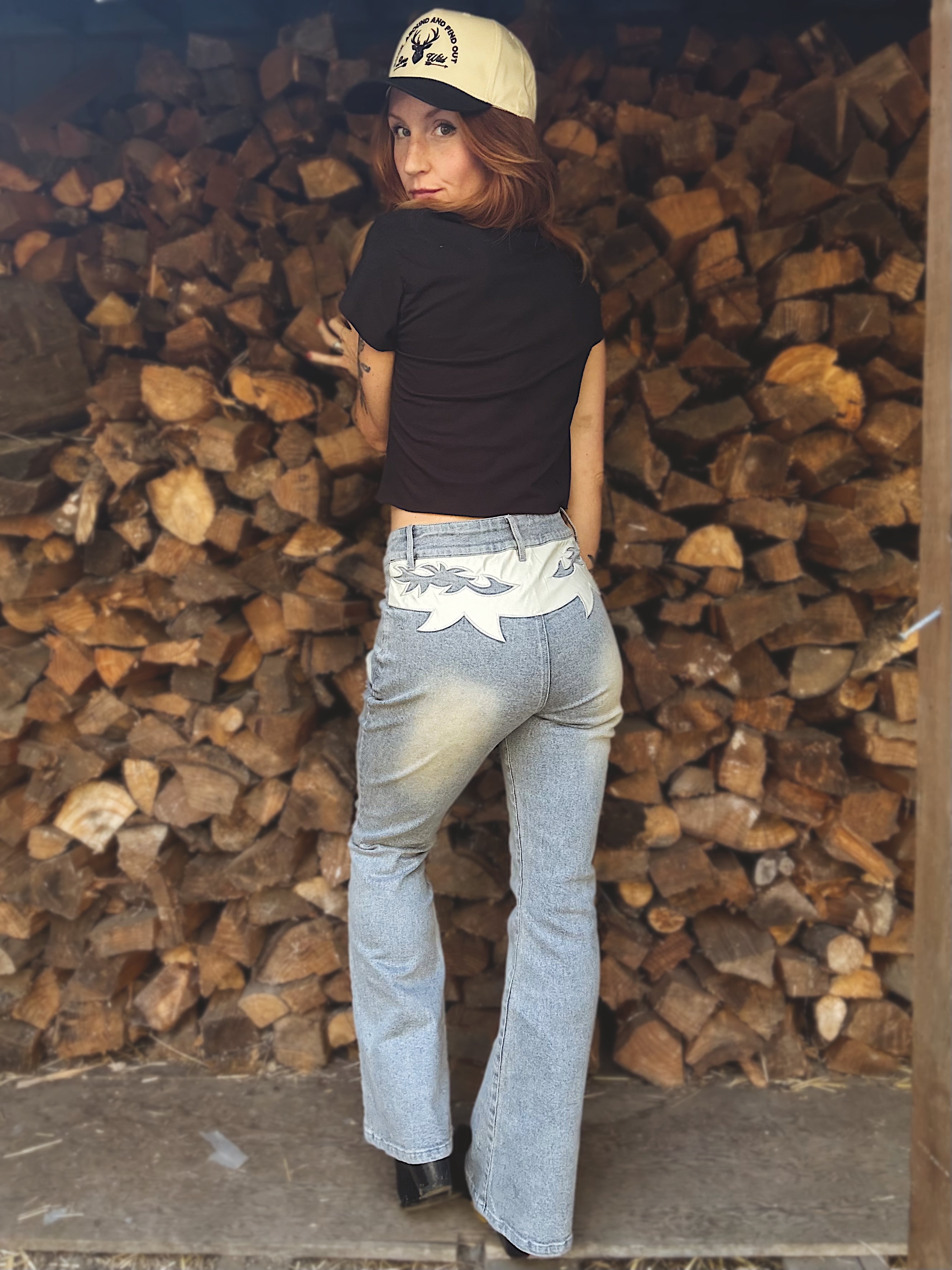 Mid-rise denim jeans featuring Western-inspired contrast patch stitching and a stretch fit for comfort.