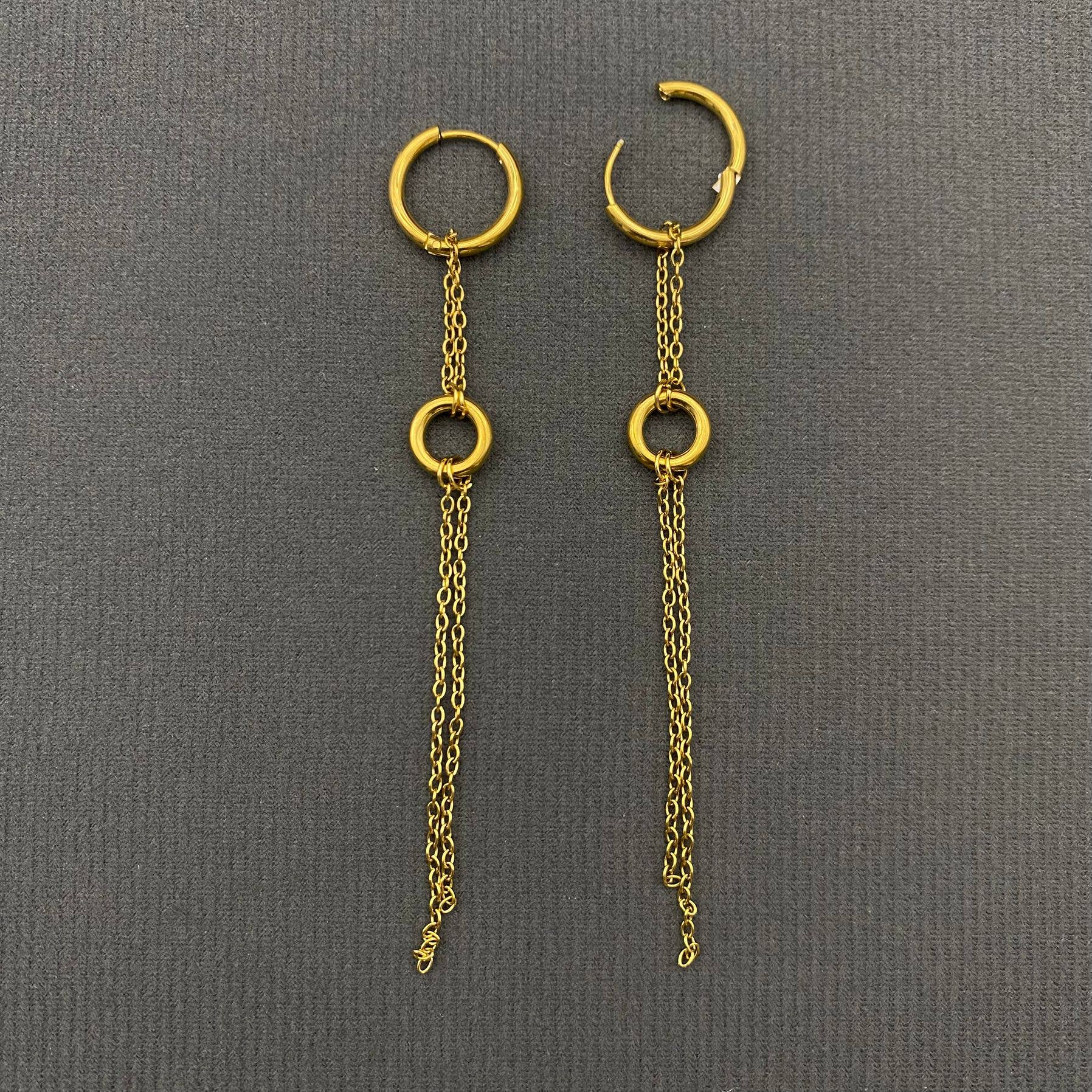Our Born to run two tone dangly earrings are  for the girl on the go. Whether they are being worn day in and day out, or packaged in a suitcase; these 18k gold plated stainless steel huggie earrings are the pair. These are an edgy Statement piece while keeping a classic huggie style.